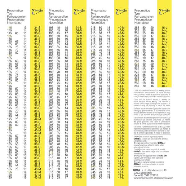 Trendy si adatta a numerosi pneumatici. Le misure seguite dalle lettere S (small), M (medium) o L (large) per pneumatici dai più piccoli ai più grandi, compresi i SUV. Per esempio, se il vostro pneumatico è 205 55 R16 la vostra taglia Trendy è la 38-M, proprio come accade per gli abiti.