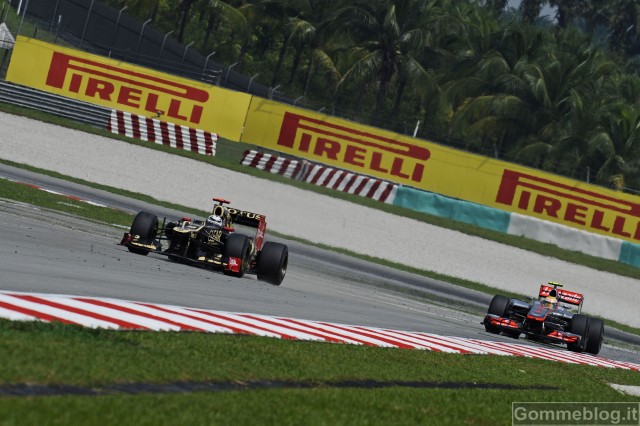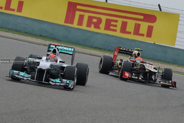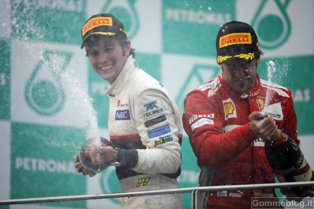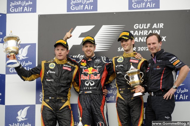 Il pilota della Lotus, Romain Grosjean, ha seguito una strategia simile a quella di Alonso ed era in una posizione di forza per sfidare la Ferrari prima di dover uscire di scena, anche lui per un problema tecnico al 40° giro. La composizione del podio si è decisa solo negli ultimi giri, dopo un finale imprevedibile caratterizzato da incidenti e sorpassi. Kimi Raikkonen è salito sul secondo gradino del podio, seguito dal pilota della Mercedes, Michael Schumacher. Anche il finlandese ha approfittato dell’entrata della safety car per montare il suo ultimo set di pneumatici, mentre Schumacher ha adottato una strategia diversa. Il terzo posto di Schumacher – il più alto in griglia (12 °) dei cinque piloti che hanno iniziato la gara con le gomme medie – rappresenta anche il suo miglior risultato dell’anno e il primo podio dal suo rientro in F1, dopo una rimonta spettacolare negli ultimi giri con le gomme morbide. Ancora una volta, tre diverse monoposto e tre diversi costruttori di motori sono saliti sul podio, occupato da tre campioni del mondo.