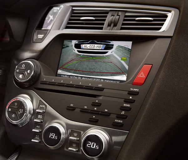 La telecamera di retromarcia, ubicata in posizione discreta sopra la targa posteriore, rinvia un’immagine a colori sul display del sistema di navigazione, previsto sistematicamente. Si attiva automaticamente all’inserimento della retromarcia. L’immagine prevede anche dei riferimenti visivi: rossi, per indicare il limite del paraurti posteriore, verdi per indicare la direzione generale di Citroen DS5. La telecamera completa i sensori di parcheggio sempre presenti. L’informazione trasmessa da questi ultimi viene riportata su una sagoma ridotta nell’angolo superiore destro dello schermo.