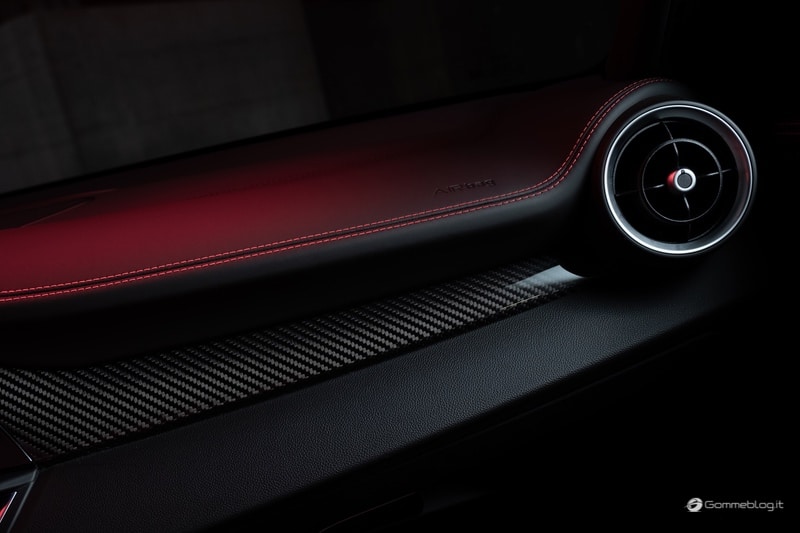 Negli esterni la fibra di carbonio è presente sugli specchietti e sul trilobo frontale. Toni scuri per lo specifico badge “ESTREMA” sul paraurti, cerchi in lega – da 19” su Alfa Romeo Giulia e 21” sulla Stelvio – e le pinze freno nere. La stessa forte connotazione sportiva si ritrova all’interno, dove spiccano le finiture in fibra di carbonio ed i sedili in Alcantara, un materiale unico che coniuga le ragioni dell’estetica e della funzionalità. Cuciture in contrasto rosse abbinate a inserti in pelle conferiscono sportività ed esclusività a cruscotto, sedili, volante e cambio.
