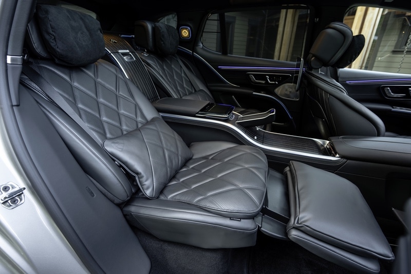Come nella Mercedes-Maybach S-Class, la dotazione aggiuntiva include due portabicchieri termici e uno scomparto per il tablet MBUX di serie per i passeggeri posteriori. Quattro porte USB-C per ricarica rapida e due interfacce HDMI garantiscono che i viaggiatori possano utilizzare senza problemi i loro dispositivi digitali. Su richiesta, la consolle centrale può includere due tavolini pieghevoli e un vano refrigerato capace di ospitare bottiglie di champagne. Come accessorio opzionale, sono disponibili calici placcati in argento.