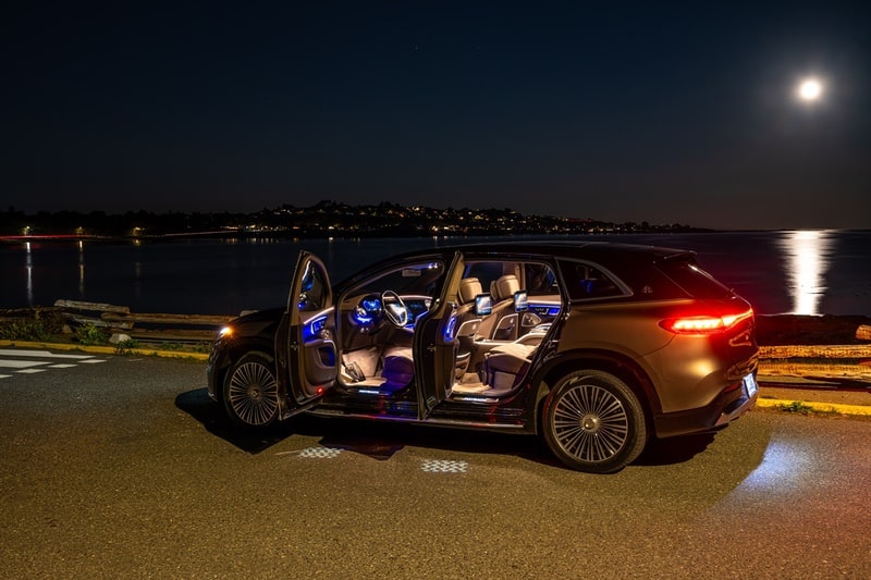 La scritta EQS è delicatamente inserita nel triangolo della finestra anteriore, mentre i passaruota enfatizzano la potenza e presenza emotiva del SUV. Le ruote in lega e forgiate, esclusive, sono da 21 o 22 pollici, con il lettering MAYBACH sui coprimozzi. Di notte, spiccano i gradini illuminati, realizzati in alluminio anodizzato che rievoca l’aspetto del pannello frontale nero.