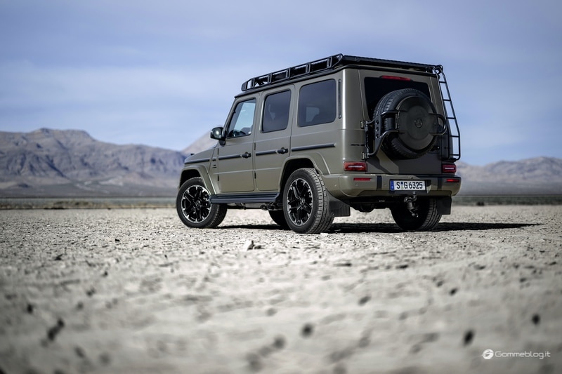 La Mercedes-Benz Classe G è da sempre riconosciuta per la sua forma inconfondibile e spigolosa, che rimane un segno distintivo anche nelle versioni più recenti. Il design iconico è stato mantenuto quasi invariato durante gli ultimi sviluppi, con dettagli classici come le maniglie delle porte, il suono caratteristico della chiusura e la ruota di scorta visibile sul portellone posteriore.