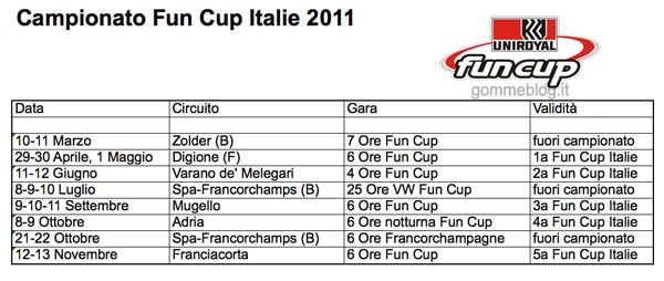 Il campionato si svolgerà su 5 tappe oltre a due appuntamenti non validi per l’assegnazione del titolo a Zolder e Spa. Le gare saranno sulla distanza delle 6 Ore, fatta eccezione per Varano in Giugno (4 Ore). La 6 Ore di Adria di Ottobre si disputerà in notturna. Gli equipaggi per ciascuna macchina potranno essere composti da due ad otto piloti, ed i cambi guida ai box saranno ogni mezzora. Non mancherà neppure quest’anno il classico appuntamento top di Luglio, la variopinta 25 Ore Fun Cup di Spa-Francorchamps, che raduna ad ogni edizione centocinquanta vetture sul circuito belga con quasi di mille piloti al via. Per incentivare la partecipazione al campionato, la DueGi Promotion ha istituito un bonus-sconto del 12% sull’iscrizione a tutte le gare per le squadre che si impegnano a disputare l’intera stagione. La novità di quest’anno è il simulatore di guida Fun Cup, che consentirà agli ospiti di cimentarsi in vere sfide con le Fun Cup virtuali nelle loro livree originali lungo i percorsi delle piste che ospitano il campionato.