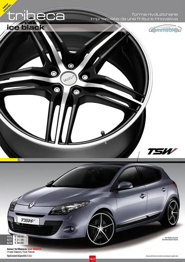 L’identità sportiva e dinamica di questi cerchi in lega TSW è evidenziata anche dalla conformazione della giunzione delle razze al canale esterno: appuntita e spigolosa; il piedino di collegamento è infatti molto sottile e acuminato, e appoggia direttamente sul canale esterno. TSW Tribeca risulta quindi avere, grazie a tutti questi elementi, un design leggero, è in grado di mettere in risalto stile e linee estetiche di auto sportive e alla moda, quali Alfa Romeo MiTo, Volkswagen Golf, Renault Magane, Audi A3, BMW Serie 1, Honda Accord e Civic, Fiat Bravo, Peugeot e tante tante altre.