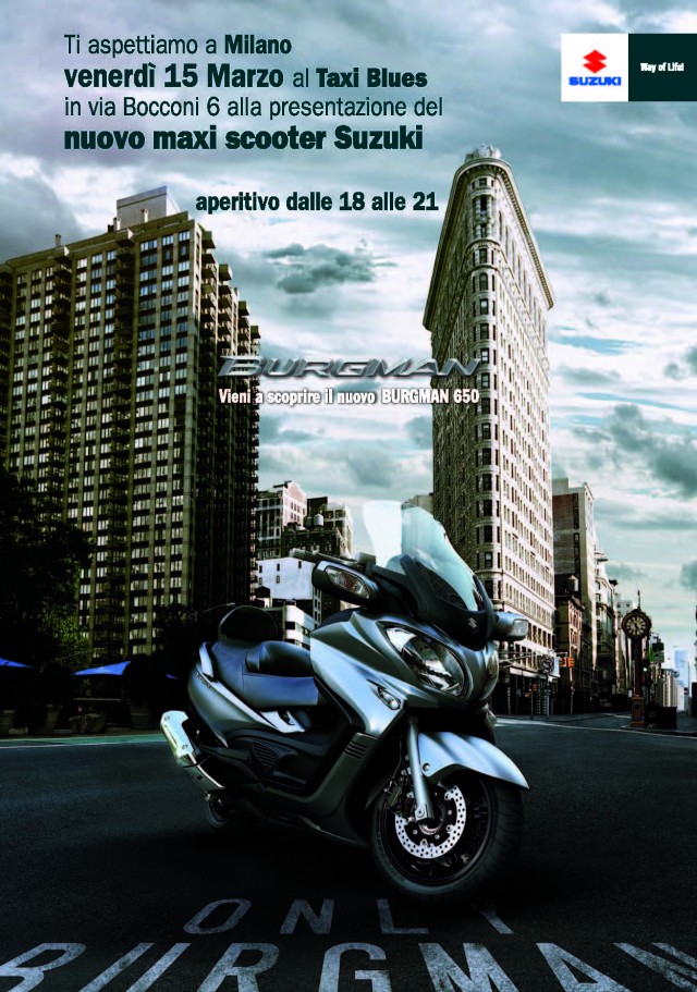 In occasione dell’aperitivo il pubblico presente potrà così scoprire da vicino caratteristiche, dotazioni e innovazioni tecnologiche del nuovo scooter in un contesto rilassante e in compagnia degli amici, con cui condividere opportunità di divertimento on the road, in sella al nuovo Burgman 650. Emblema del comfort e del lusso di alta gamma, il nuovo Suzuki Burgman 650 darà prova delle sue qualità sabato 16 e domenica 17 marzo, quando gli interessati potranno cimentarsi in un giro di prova su strada organizzato dai concessionari Suzuki aderenti all’iniziativa, consultabili all’indirizzo: http://moto.suzuki.it/eventi/1965/evento-nuovo-burgman-650-a-milano.aspx