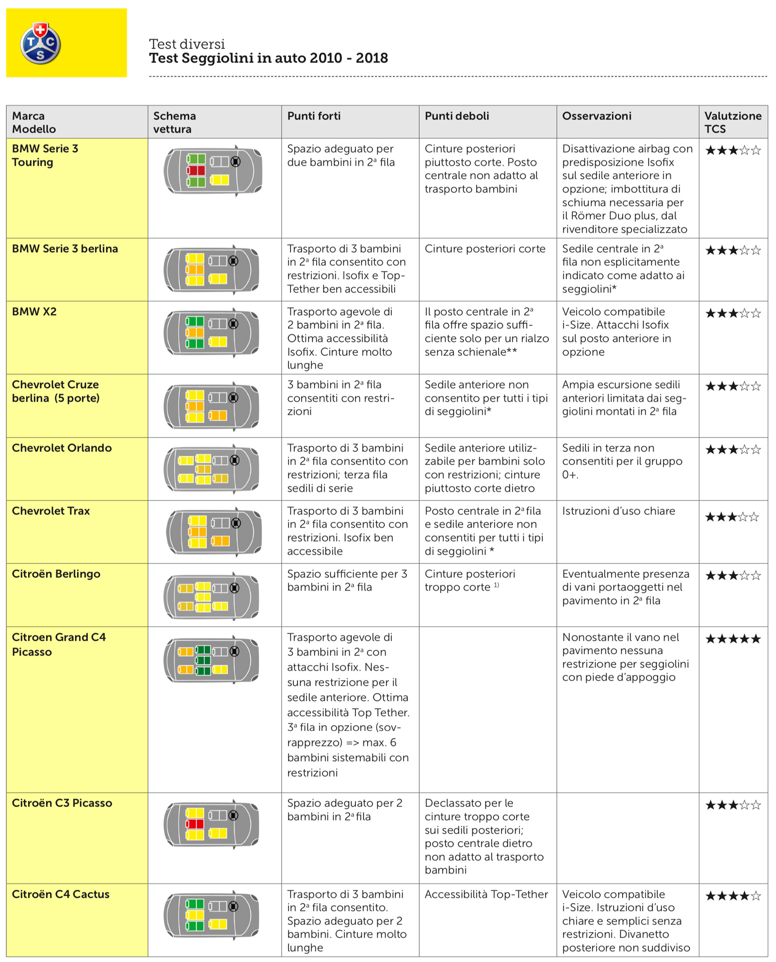 Seggiolini Bambini in Auto 2018. Sono considerate auto familiari, ma questo non significa che siano l’ideale per il trasporto dei bambini. Delle 18 vetture testate, solo in una è stato possibile montare tre grandi seggiolini per bambini sui sedili posteriori. Le altre non offrono sufficiente spazio, oppure il sedile centrale posteriore non è considerato dal costruttore idoneo per tale scopo.