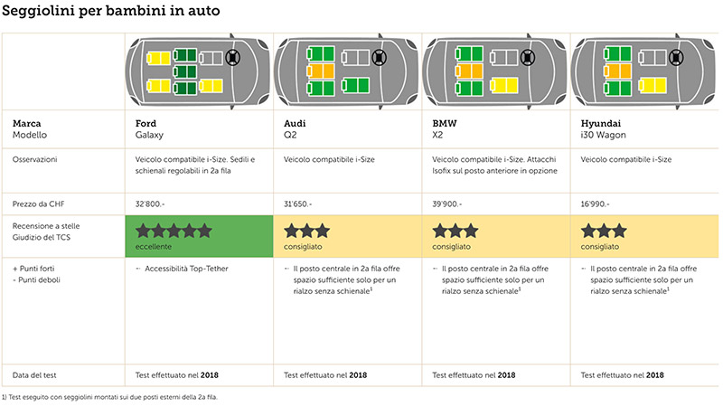 I sedili posteriori sono il posto più sicuro per trasportare i bambini, per questo motivo il sedile a fianco del conducente viene valutato «molto buono» unicamente se dispone di disattivazione automatica dell’airbag e degli ancoraggi Isofix.