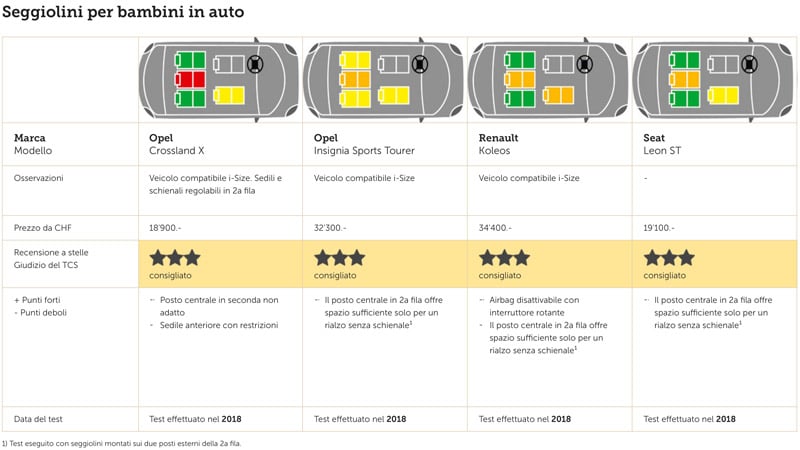 I modelli Dacia Duster, Mitsubishi Eclipse Cross e Opel Crossland X hanno ottenuto il risultato «non idoneo» a causa delle istruzioni d’uso restrittive, che indicano, per i seggiolini, il sedile centrale posteriore «non idoneo». Gli altri 14 veicoli hanno ottenuto la valutazione «con restrizioni», perché il sedile centrale offre sufficiente spazio unicamente per un rialzo privo di schienale.