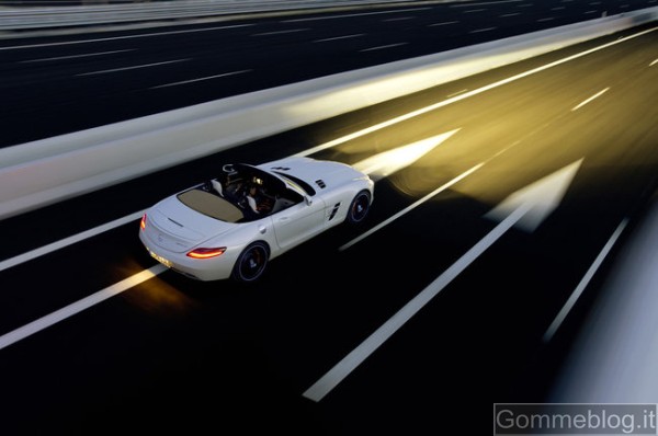 A dispetto della sua notevole sportività, la vettura vanta consumi estremamente interessanti. Come la “Ali di gabbiano”, la SLS AMG Roadster consuma 13,2 litri di carburante ogni 100 km (NEDC combinato), equivalenti ad un livello di emissioni di CO2 di 308 grammi al chilometro. Tra le misure adottate per migliorare l’efficienza figurano non soltanto le camicie dei cilindri rivestite in NANOSLIDE a basso attrito e la lubrificazione ottimizzata in base all’effettiva necessità, ma anche la gestione intelligente dell’alternatore. Quando il motore è in fase di rilascio, l’energia cinetica viene utilizzata per caricare la batteria anziché disperdersi, come normalmente avviene, sotto forma di calore. La sofisticata tecnologia del catalizzatore permette di soddisfare i valori limite imposti per le emissioni allo scarico dalle norme antinquinamento già in vigore e di prossima emanazione, come EU 5, LEV 2 e ULEV.