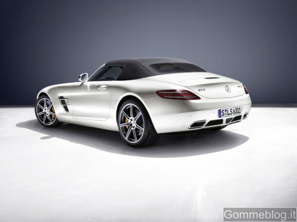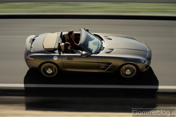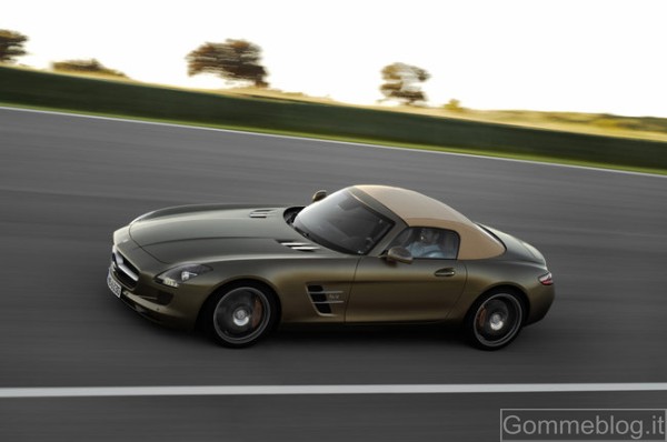 Con il nuovo Roadster, la gamma AMG si arricchisce di un secondo modello di gran fascino. «Proprio come per la “ali di gabbiano”, a catturare immediatamente l’attenzione è il design purista ed atletico», commenta Gorden Wagener, Head of Design. A tetto aperto o chiuso, la SLS AMG Roadster è un vero e proprio piacere per gli occhi!». L’aspetto forse più sorprendente sono le proporzioni: cofano motore lungo, parte superiore molto arretrata e coda corta. A questo si aggiungono l’alettone ad estrazione automatica, il passo lungo, l’ampia carreggiata e gli sbalzi ridotti. In poche parole, anche la SLS AMG scoperta è un’auto dal carisma autentico che sprigiona dinamismo alla massima potenza. Le spalle pronunciate sembrano muscoli in tensione che, insieme ai grandi cerchi 265/35 ZR 19 (ant.) e 295/30 ZR 20 (post.), trasmettono una sensazione di potenza allo stato puro. Tra i nuovi equipaggiamenti a richiesta figurano l’accattivante vernice metallizzata marrone Sepang AMG e i cerchi fucinati a 10 razze dal peso ottimizzato, in nero opaco con bordo tornito a specchio. I paralleli stilistici con la 300 SL Roadster degli anni Cinquanta si riscontrano nell’ampia mascherina del radiatore con la grande Stella Mercedes e nelle feritoie laterali suddivise da alette, ma anche nelle alette su cofano motore e fiancate. Come la SLS AMG Roadster, anche la 300 SL Roadster fu lanciata dopo il modello originario 300 SL “ali di gabbiano”. Diversamente da allora, però, oggi i due affascinanti modelli AMG sono disponibili contemporaneamente.