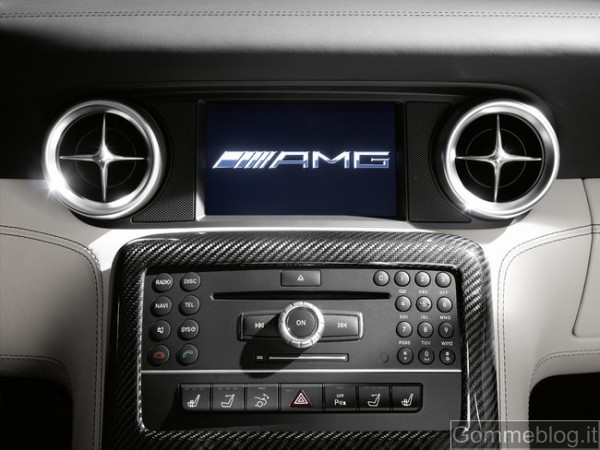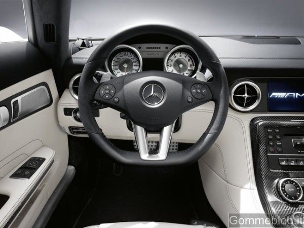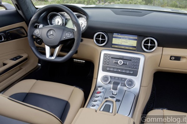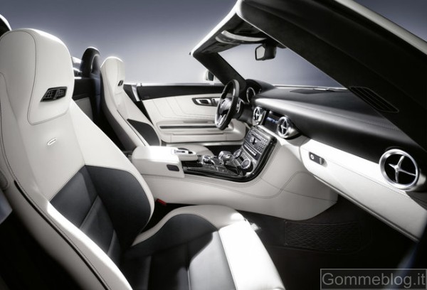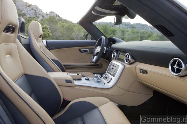 I rivestimenti in purissima pelle, le superfici in metallo opacizzato e gli inserti in carbonio (a richiesta) creano un’atmosfera esclusiva che ben si concilia con la sensazione di trovarsi all’interno di una cabina di pilotaggio. Le cuciture decorative e a contrasto eseguite con assoluta precisione hanno un grande impatto estetico, che vale a sottolineare la qualità della finitura artigianale e la cura riservata ai dettagli dai designer Mercedes. Tra gli equipaggiamenti di serie della SLS AMG Roadster figurano i rivestimenti in pelle nera designo, i sedili sportivi riscaldabili AMG, il frangivento a innesto, il COMAND APS con lettore DVD, l’impianto antifurto con protezione antitraino e dell’abitacolo, il climatizzatore automatico COMFORTMATIC e la funzione avviamento KEYLESS-GO. A richiesta è disponibile l’AIRSCARF®. Questo sistema brevettato, offerto esclusivamente da Mercedes-Benz, funziona come una sciarpa invisibile che avvolge collo e nuca dei passeggeri con un fascio di aria calda. L’AIRSCARF® è integrato negli schienali dei sedili sportivi AMG e dispone di ugelli incorporati nei poggiatesta dai quali fuoriesce un flusso di aria calda. In abbinamento ai rivestimenti a richiesta in pelle Exclusive designo è possibile optare per i roll-bar in pelle con griglie integrate che riducono le turbolenze nell’abitacolo. Nei retrovisori esterni ripiegabili elettricamente, disponibili a richiesta, sono integrate le luci di cortesia. Per gli interni, una nuova variante è costituita dai rivestimenti in pelle marrone caffè designo, anche bicolore. La tonalità scura di questo rivestimento s’intona alla perfezione con la nuova vernice metallizzata marrone Sepang AMG.