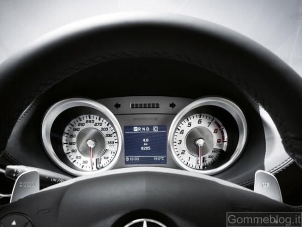 L’impianto frenante ad alte prestazioni AMG con dischi in materiale composito sull’asse anteriore garantisce spazi di arresto brevissimi anche in caso di sollecitazioni estreme. Sin dal lancio della vettura saranno disponibili pinze rosse (a richiesta) per tutte le ruote. A garantire prestazioni frenanti ancora più elevate provvede l’impianto frenante ad alte prestazioni con dischi in materiale composito e ceramica maggiorati. Grazie al loro maggiore grado di indurimento, i dischi in ceramica sono affidabili anche alle temperature di esercizio più elevate e si segnalano per il peso ridotto di circa il 40%. La riduzione delle masse non sospese va a tutto vantaggio del comfort e dell’aderenza, mentre l’alleggerimento delle masse rotanti sull’asse anteriore assicura una risposta più diretta dello sterzo. La costruzione leggera è stata al centro dell’attenzione anche per le ruote: i cerchi in lega AMG basati sul principio del “flow forming” riducono le masse non sospese, migliorando la dinamica di marcia e il comfort. Oltre ai cerchi in lega AMG a 7 razze di serie, sono disponibili a richiesta anche cerchi a 5 doppie razze e cerchi fucinati a 10 razze. Gli pneumatici da 265/35 R 19 (anteriori) e 295/30 R 20 (posteriori), sviluppati in esclusiva per la SLS AMG, assicurano prestazioni eccellenti. Le dotazioni di serie comprendono il sistema di controllo pressione pneumatici che controlla costantemente la pressione di tutte le ruote, visualizzando sul display i dati registrati per ogni pneumatico.
