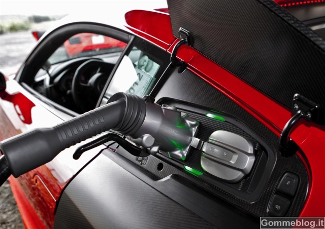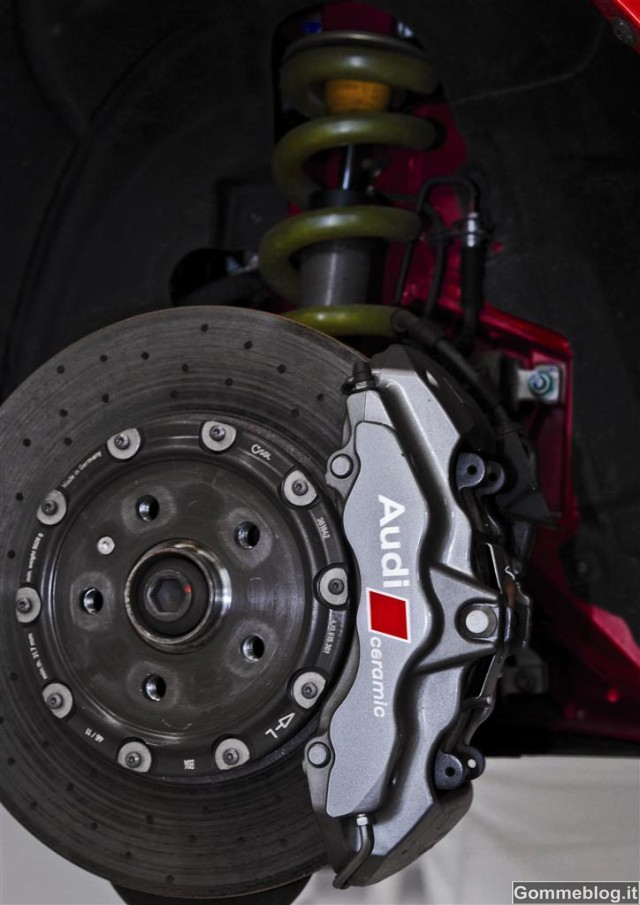 La vettura portata sul tracciato del Nürburgring corrisponde in ogni dettaglio al modello che arriverà sul mercato alla fine di quest’anno – continua Dick. I due motori elettrici generano una potenza di 280 kW e 820 Nm di coppia: partendo da fermo, sono più di 4.900 i Nm distribuiti tra le ruote posteriori. La R8 e-tron accelera da 0 a 100 km/h in 4,6 secondi e raggiunge la velocità massima, limitata elettronicamente, di 200 km/h. Per ottenere il tempo record, la punta massima è stata portata a 250 km/h. Le batterie agli ioni di litio permettono di stoccare 49 KWh di energia, abbastanza per percorrere una distanza di 215 km. La forma a “T” del pacco di accumulatori permette l’alloggiamento all’interno del tunnel centrale e nella zona tra abitacolo e retrotreno. Un sistema di recupero di energia alimenta le batterie in frenata e durante le fasi di rilascio. 0La scocca della vettura è realizzata principalmente in alluminio, con molte componenti in CFRP. Ciò ha permesso di contenere la massa in 1780 kg.