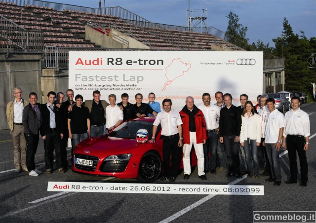 La R8 e-tron ha dato una splendida dimostrazione del suo potenziale, sul più difficile tracciato al mondo” ha “Il record ottenuto ci conferma che siamo sulla buona strada. Per noi la mobilità elettrica non deve significare rinuncia, piuttosto deve richiamare emozione, sportività e piacere di guida. Per apprezzare appieno il risultato ottenuto dalla Audi R8 e-tron basta considerare che il giro record per una vettura di serie con motore a combustione (Gumpert Apollo Sport, motore Audi V8 da 700 CV) è attualmente di 7’11”.57.