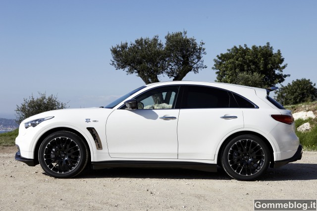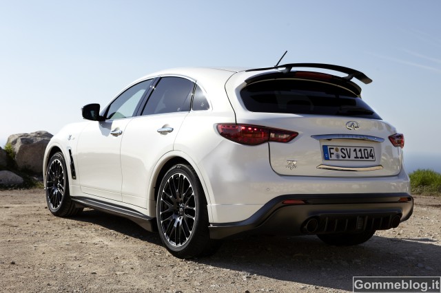 Il design degli esterni unisce alle forme già molto dinamiche dell’FX50 elementi dell’altra “auto aziendale” di Sebastian Vettel, la RB8 di Red Bull Racing. Fibra di carbonio del tipo utilizzato in F1 sostituisce parti della carrozzeria standard per creare il nuovo look, caratterizzato sul davanti da una sezione sotto-paraurti completamente ridisegnata. Ispirata al profilo frontale dell’RB8, lo spoiler a più strati riduce peso e resistenza aerodinamica, agevola il flusso dell’aria sotto la vettura e svolge un ruolo fondamentale nell’equilibrare la deportanza. Disegnata da Shiro Nakamura, la sezione dello spoiler rappresenta forse il più lampante esempio di come elementi di design della F1 possano perfezionare un’auto di serie.