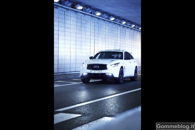 Nell’FX Vettel Edition, la potenza arriva a 420 CV grazie a modifiche che includono un nuovo sistema di scarico. Ne trae vantaggio anche la coppia massima: fino a 520 Nm anziché i già notevoli 500 Nm. L’ottimizzazione del flusso e dei flap di scarico, controllabili da un pulsante sul cruscotto, consentono di incrementare potenza ed efficienza, oltre ad arricchire il piacere di guida con la massima sonorità del V8. L’incremento sonoro è udibile solo quando il motore è sotto carico oppure quando il cambio è in modalità manuale e “fa scattare” l’acceleratore allo scalare delle marce; in condizioni di crociera normali, la vettura conserva tutta la raffinatezza del modello standard. Il nuovo profilo della carrozzeria e l’assetto ribassato apportano miglioramenti aerodinamici che, abbinati alle modifiche delle sospensioni, donano a un’auto già agile e pronta alla risposta superiori capacità a tutte le velocità. E, in termini di aderenza, precisione, equilibrio e trazione, l’FX Vettel Edition non ha nulla da invidiare a un’auto sportiva.