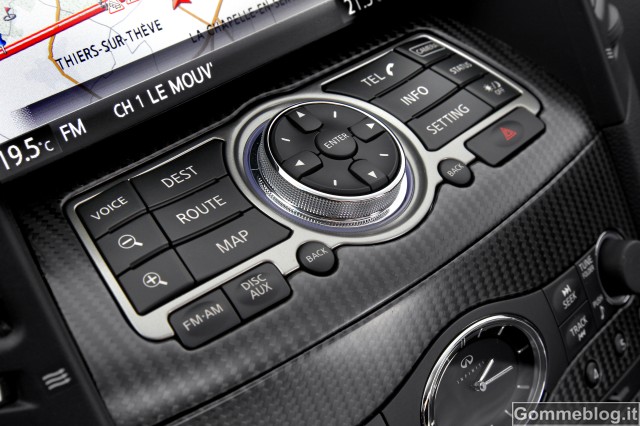 INTERNI – Un altro logo Vettel è presente nell’abitacolo: è inserito all’interno del pannello in fibra di carbonio della console centrale. Dietro la copertura si trova il pulsante con contorno blu luminoso che apre le chiusure dei tubi di scarico – la garanzia che l’FX Vettel Edition offre al conducente di una colonna sonora entusiasmante per il V8. La fibra di carbonio utilizzata negli interni è applicata mediante un processo “a umido”, ovvero è applicata direttamente alla struttura per ottenere la finitura più precisa e della più alta qualità possibile. Questo materiale riveste il corpo centrale ed è utilizzato anche nelle finiture delle portiere e sopra il vano portaoggetti. La sensazione tecnica è esaltata dall’Alcantara che sostituisce la pelle nella parte centrale dei sedili. Quelli anteriori, con 14 regolazioni elettriche (comprese quelle per il contenimento laterale della seduta e dello schienale), offrono il sostegno perfetto in curva, indispensabile per un’auto come l’FX Vettel Edition. L’Alcantara è impiegata anche nel rivestimento dei montanti laterali e del tetto. Volante e leva del cambio sono rivestiti in pelle e le cuciture viola – tocco esclusivo di Infiniti – sottolineano tutti i profili. Le modifiche non vanno naturalmente a scapito del lusso o delle dotazioni di serie che sono il marchio di fabbrica dell’FX. L’abitacolo ospita, con ampio spazio per le gambe, fino a 5 persone e, con un bagagliaio da 410 litri, l’FX Vettel Edition può fungere ugualmente da limousine o da mezzo di trasporto: uno dei motivi per cui si adatta così bene allo stile di vita di Sebastian Vettel. Un portellone posteriore ad azionamento elettrico e altezza programmabile è una delle numerose caratteristiche recentemente aggiunte a tutti i modelli FX.