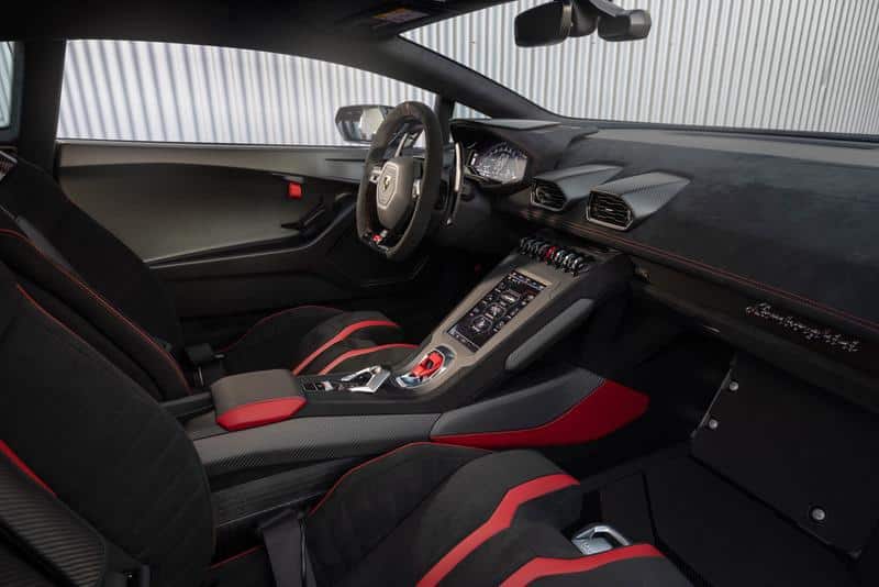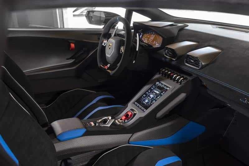 Gli interni della Huracán STO sono progettati su misura, riflettendo il carattere leggero degli esterni. L’ampio utilizzo di fibra di carbonio è evidente in tutto l’abitacolo: dai sedili sportivi interamente realizzati in questo materiale agli interni in Alcantara® con Lamborghini CarbonSkin, fino ai tappetini in fibra di carbonio e ai pannelli leggeri delle porte completamente realizzati in fibra di carbonio. Un telaio tubolare con cinture di sicurezza a quattro punti e un vano anteriore appositamente progettato per riporre il casco sottolineano il DNA sportivo della Huracán STO. Questo telaio tubolare posteriore, realizzato in collaborazione con il Partner Tecnico Akrapovič, utilizza una lega di titanio che lo rende più leggero del 40% rispetto a un tradizionale telaio in acciaio inossidabile.
