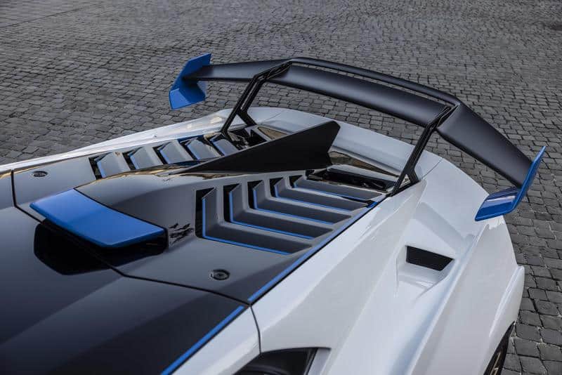 Il nuovo parafango posteriore, ereditato dalla Lamborghini Huracán Super Trofeo EVO, riduce la resistenza aerodinamica della vettura, aumentando contemporaneamente la deportanza posteriore e l’efficienza aerodinamica complessiva. Un condotto NACA integrato nel parafango posteriore della STO funge da presa d’aria per il motore, riducendo le perdite di pressione statica del 30% grazie alla sua lunghezza ottimizzata.