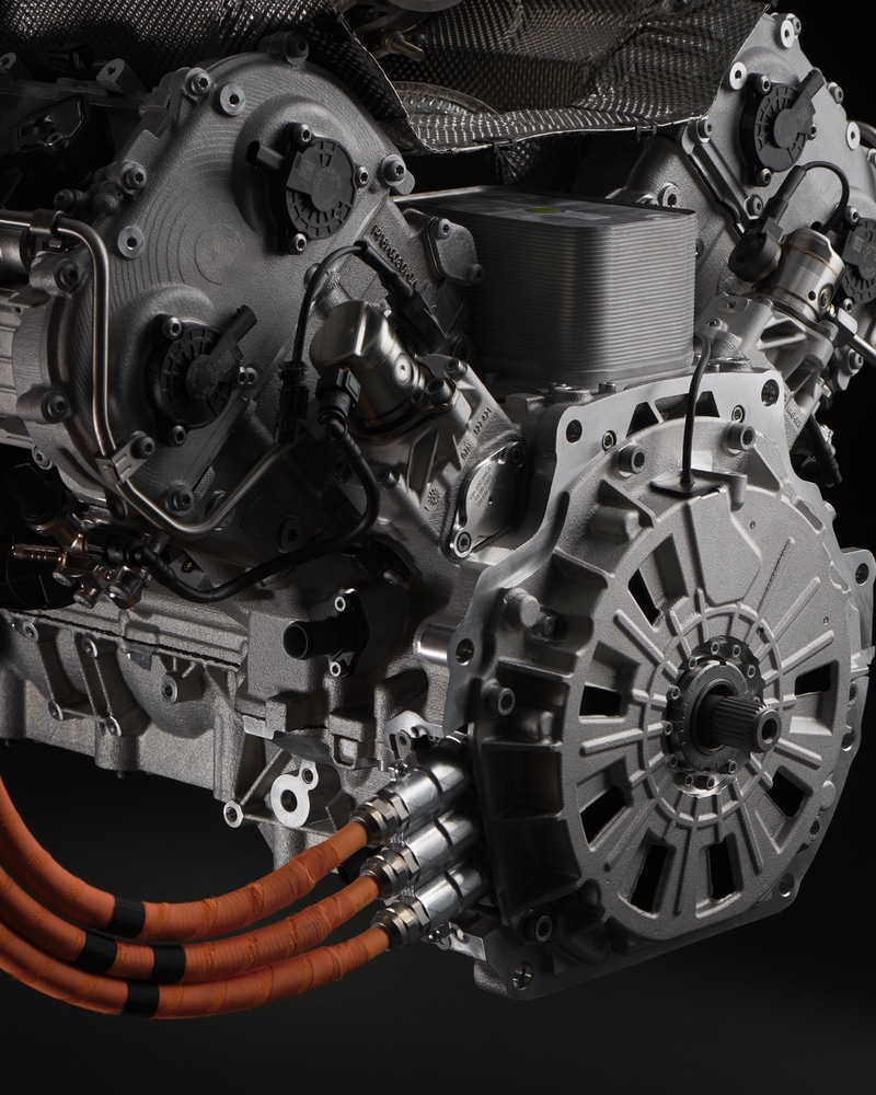 Il V8 biturbo ha una cilindrata di 4,0 litri e una potenza specifica eccezionale di 200 CV per litro. Il motore termico può erogare una potenza massima di 800 CV tra i 9.000 e i 9.750 giri/minuto, raggiungendo un massimo di 10.000 giri/minuto, un regime solitamente riservato ai motori da competizione, rendendo così il nuovo V8 unico nel panorama delle supersportive stradali. La coppia motrice è altrettanto impressionante, con un valore di 730 Nm tra i 4.000 e i 7.000 giri/minuto, offrendo una progressione entusiasmante simile a quella di un motore da corsa, grazie all’integrazione perfetta con l’unità elettrica.