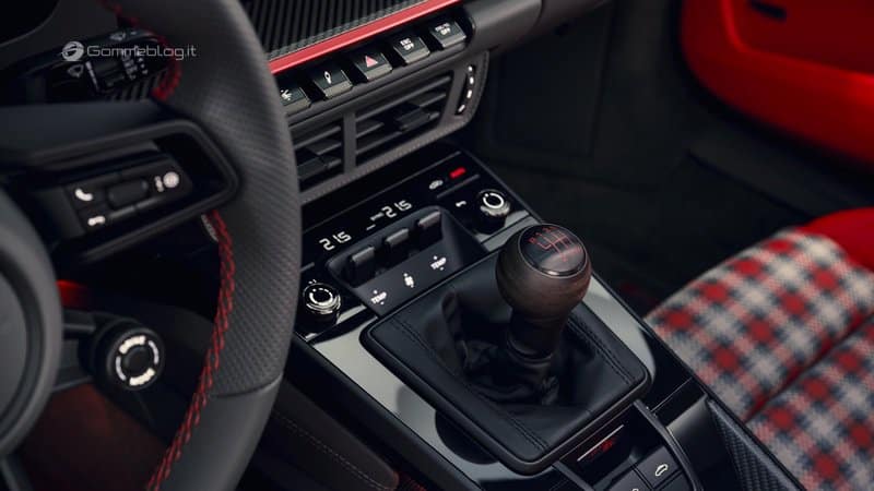 Il cambio è un manuale GT a sei marce con rapporto finale corto, soluzione che avvicina la GT3 S/C alla 911 S/T e alla 911 GT3. Non è solo una scelta emozionale: una rapportatura corta rende più densa la relazione tra regime, velocità e lavoro del guidatore, aumentando la sensazione di coinvolgimento. Porsche dichiara 0-100 km/h in 3,9 secondi e 313 km/h di velocità massima.