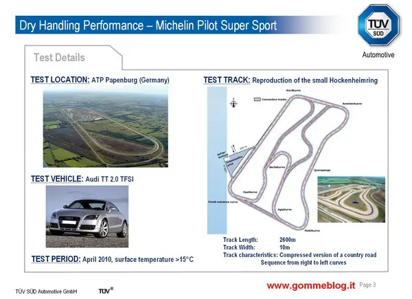 In questo secondo test gomme, il TUV ha testato la misura 235/35 ZR19 Y. Le gomme sono stati acquistati presso gommisti e rivenditori (gli stessi pneumatici che acquisterebbe un qualsiasi automobilista) ad eccezione dei Pilot Super Sport che non essendo ancora in commercio sono stati forniti dalla casa. I test si sono svolti sulla pista di Papenburg in Germania, tracciato che per misura e conformazione riproduce il piccolo Hockenheim.