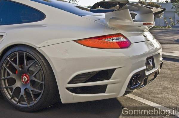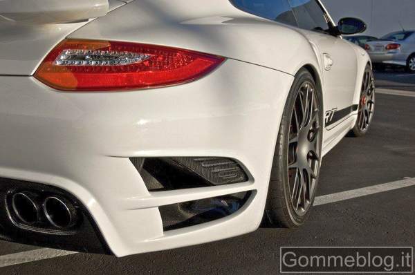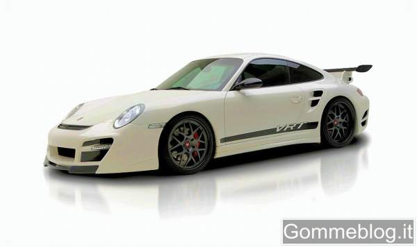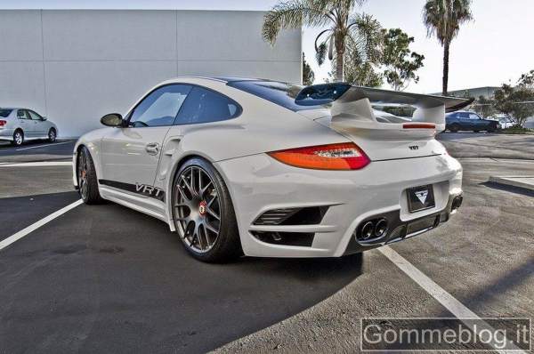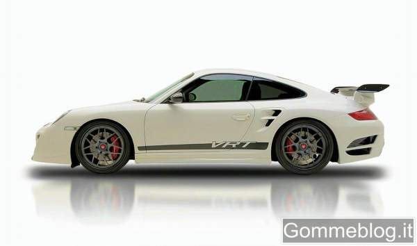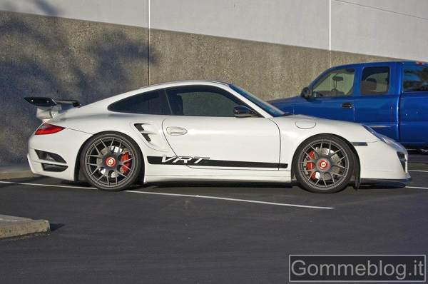 Vorsteiner mostra al pubblico la sua ultimissima elaborazione su base 911 Turbo, il nuovo kik Vorsteiner Race Technologies (V-RT). Tanti i particolari in fibra di carbonio atti a modificare l’aerodinamica della vettura, rinnovati i 4 cerchi in lega e pneumatici ultra performance Michelin Pilot Sport 2. All’anteriore spiccano le prese d’aria maggiorate mentre al posteriore il nuovo paraurti incorpora l’estrattore (sempre in fibra di carbonio) che integra il terminale di scarico a 4 uscite. Enormi i cerchi in lega da ben 20 pollici (modello V-306) scomponibili in tre pezzi (il tuner propone tuttavia anche una variante con cerchi in lega originali Porsche con dado di fissaggio unico) in grado di ospitare pneumatici ad elevate prestazioni Michelin Pilot Sport 2.